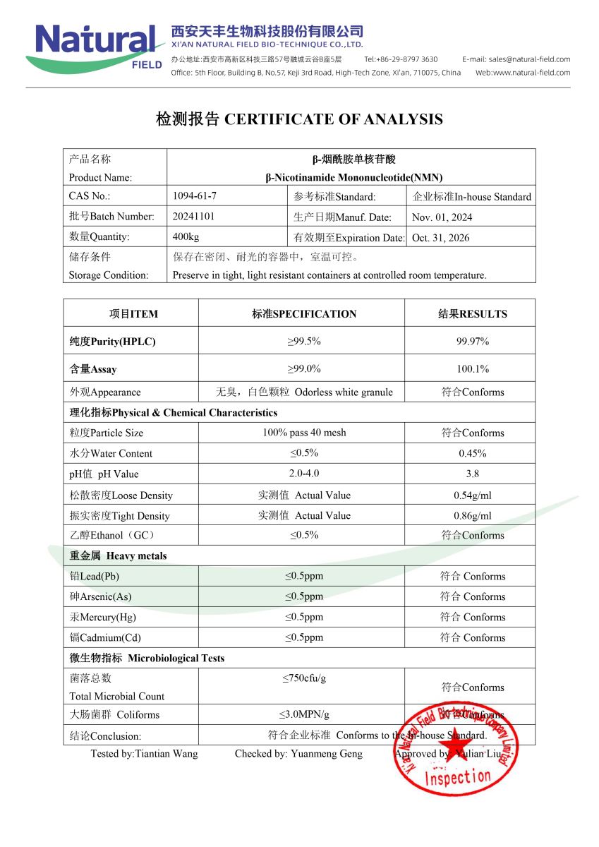 Sử dụng 100% Beta-NMN hoạt tính cao, được kiểm định nghiêm ngặt qua chứng nhận COA (Certificate of Analysis).